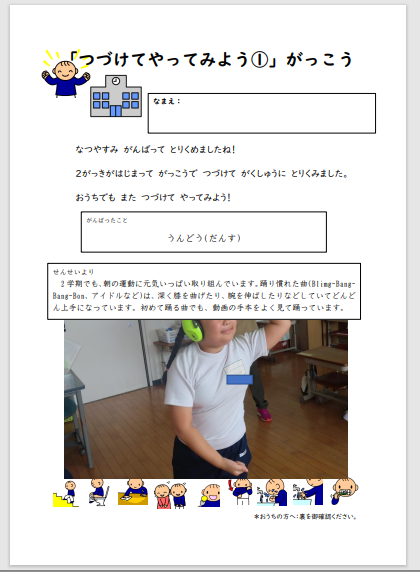 シートの表面は、夏休み後の学校での取り組みの様子をお知らせする形式になっています。