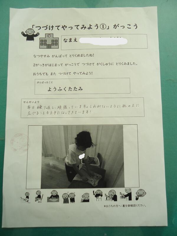 夏休みの頃よりも上手にたためていました。向きを変えてたたみやすくする工夫もしていました。学校の体操着の準備も一緒に頑張りました。楽しそうに頑張る姿がすてきだなーと思いました!!