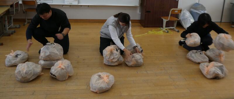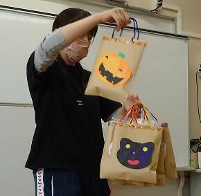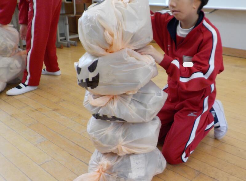 ジャック・オ・ランタンに見立てた新聞の入ったオレンジの袋をバランス良く積み重ねていくゲームのようですにっこり