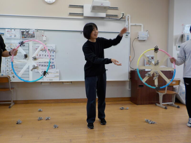 まるめた新聞紙をくものすに見立てたテープつきの的に向けて投げるゲーム