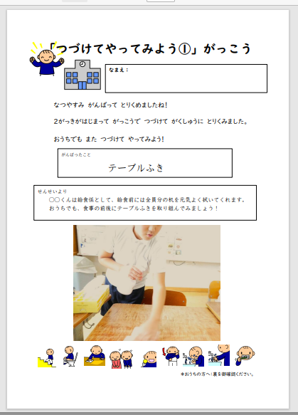 テーブルふき、がんばっています(ホームワーク週間その後・家庭との連携⑭)