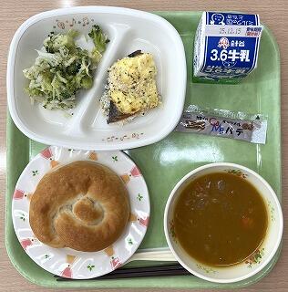米粉パン キャラメルパテ カレースープ 鮭のタルタルパン粉焼き ブロッコリーサラダ 牛乳