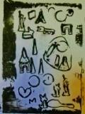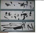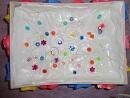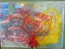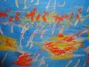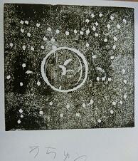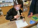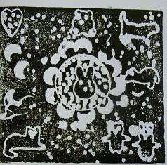 図工の時間に、スチレン版画をしました。木槌やきりなどを使って、スチレンにデザインしていき、黒インクを塗り、ばれんをかけてできあがりです。 児童は「宇宙」をイメージして完成していました。
