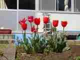 昨年度植えたチューリップや桜の花が満開となり、生徒達を迎えました。