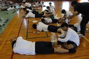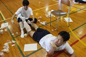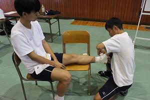 本校卒業生の2名の柔道整復師を講師としてお招きし、怪我に対する応急処置の基礎知識について学んだり、小関節や足関節のテーピングの巻き方を教えてもらったりしました