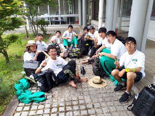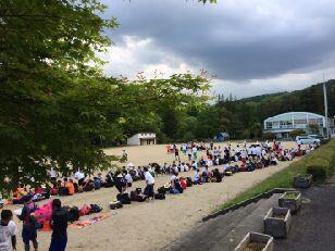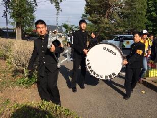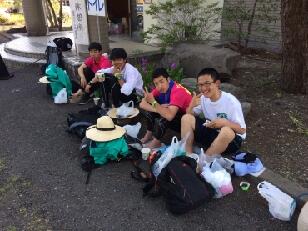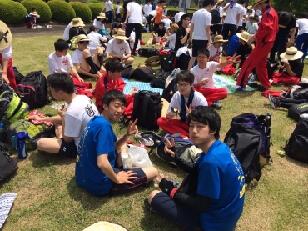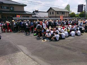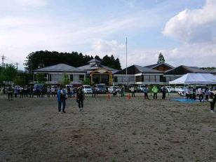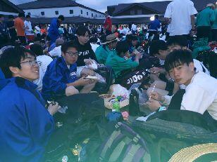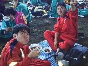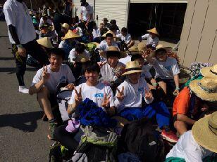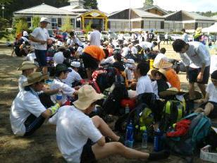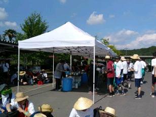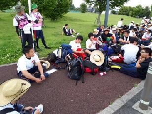 見事な先導歩により、時間通りに旧川西中学校に到着しました。ここではPTA黒羽支部にお世話になって、朝食がふるまわれます。黒羽支部は、この日のために草刈りから準備をしていただいています。