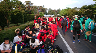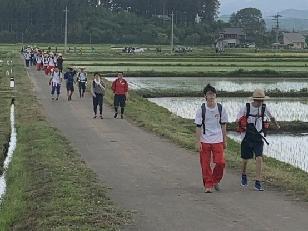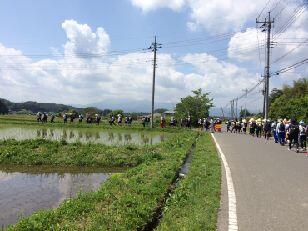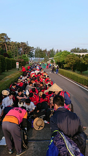 ゴール前の最後の関門である道の駅那須与一の郷に到着しました。最後の給水はPTA金田支部が担当しています。昨日の9時45分から歩き始めてほぼ24時間が経過し、新しい時代最初の85キロ強歩があと8キロ余りで終わろうとしています。今、どんなことを考えながら歩いているのでしょうか。
