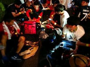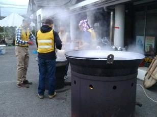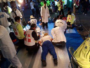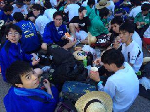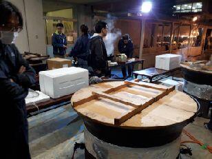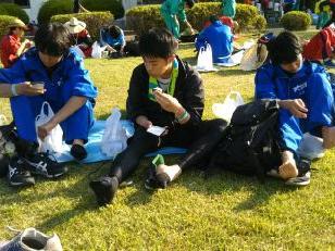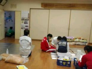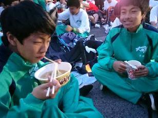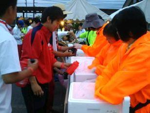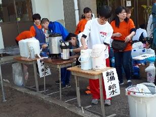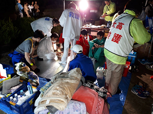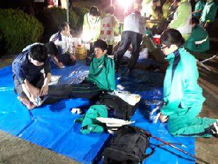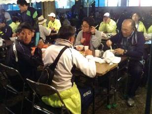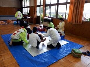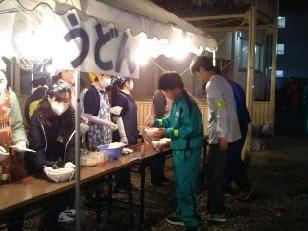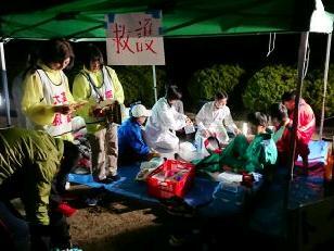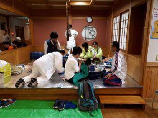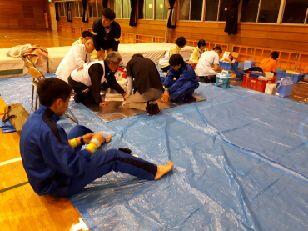 暖かいそばやうどんで身体を温め、ほっと一息です。本校の職員もごちそうになりました。食事のあとは、仮眠を取る様子が見られました。また、ここでも医療団は大活躍でした。3人のドクターと看護師に手当をしていただきました。