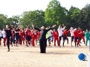 好天に恵まれ、校庭で85キロ強歩の出発式が行われました。校長先生の挨拶、PTA会長と同窓会会長の激励の言葉、学校特別功労者の臼井亮平先生のお話がありました。その後、生徒会長と強歩委員会委員長が檄を飛ばして出発式は終了しました。