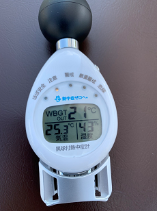 庶務の仕事の一つに、気温、湿度等の記録があります。WGBT(Wet-Bulb Globe Temperature)測定器を用いて、気温、湿度、暑さ指数を計測しています。