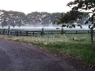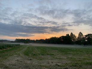 鍋掛牧場の朝霧、そして生徒のゴールを待つ学校、二日目の朝です。