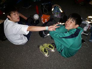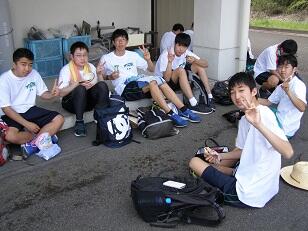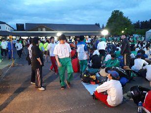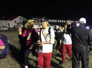 夕暮れが迫る午後6時30分、湯の香しおばらに到着しました。34.5キロ、全体の4割の行程を歩きました。足にまめができている生徒もいて、医療団にお世話になっています。また、ここではPTA西那須野の皆様が支援をしてくれています。