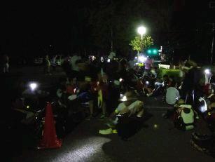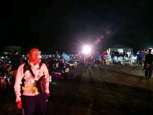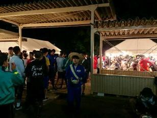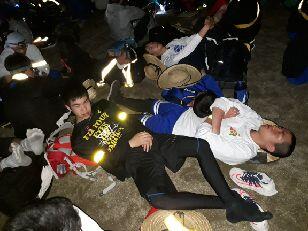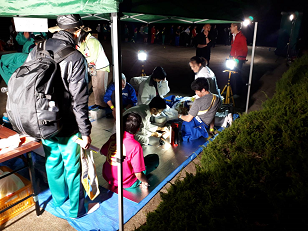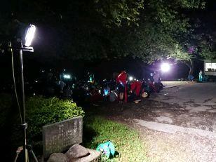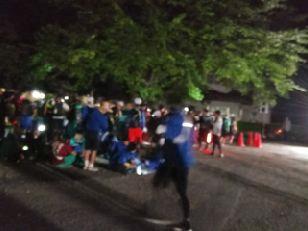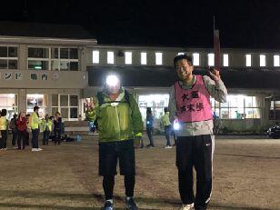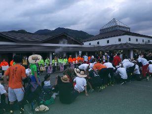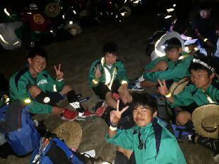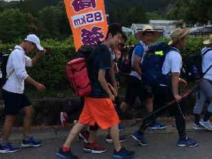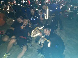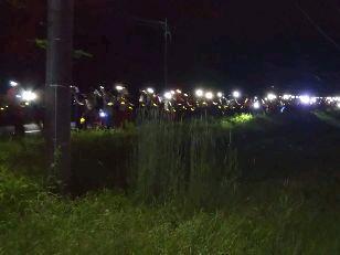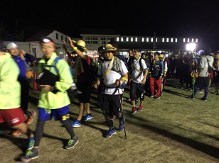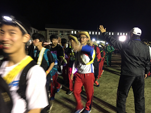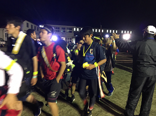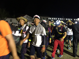 お湯や氷をもらい、持参した晩ご飯でエネルギーをチャージします。湯の香しおばらを出発すると、山間部の夜間歩行となります。タスキをかけ、明かりをつけて、グループごとに歩きます。気温が下がって厳しい歩行になりますが、励まし合って、Let's Go!