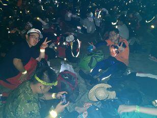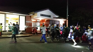 蟇沼公民館の画像です。あたりは真っ暗、生徒はヘッドランプ等をつけて歩きます。