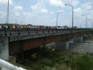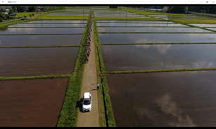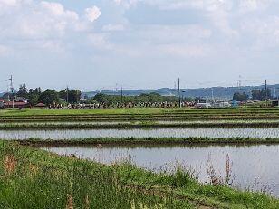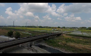 箒川にかかるかさね橋を通過して矢板市農村環境改善センターに向かいます。上空では、那須清峰高建設工学科の先生と生徒の協力を得て、ドローンが強歩の様子を撮影しています。