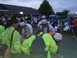 午前4時鍋掛小学校です。さすがに疲れが見え、眠さのピークです。鍋掛小学校の皆さんが、校舎の明かりをつけて迎えてくれました。PTA那須支部の皆様、ありがとうございます。