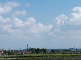 田んぼは既に田植えが終わっています。空には青空と雲、生徒の姿を映すたんぼ道を矢板中学校に向かっています。