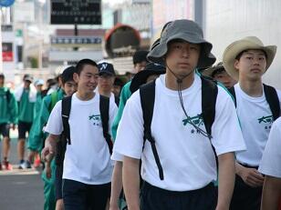 85キロ強歩の先頭と最後尾は、職員が「先導歩」「終末歩」として交代で歩いています。特に、先導歩は決められたスピードで歩き、到着予定時刻に合わせて生徒を各関門、ポイントに導きます。先導歩は、1分と違わず歩いています。