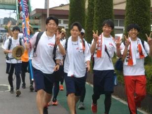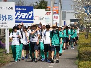 最後の関門を過ぎ、多くの保護者がゴールを待つ大高へ歩みを進めました。その前に、保健センターで態勢を整え、大女高前へと進みました。大女高では、横断幕を掲げ、沿道に多くの生徒が出て声援を送ってくれました。先頭だけではなく、長時間に渡って最後の方の生徒まで応援をしてくれました。大高生はそれに大高ストームで応えました。