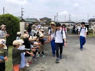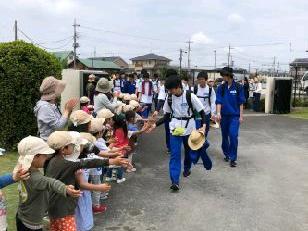 美原運動公園に到着しました。パンダ組の園児とハイタッチ!