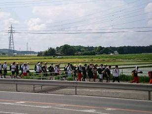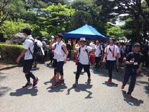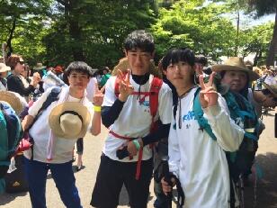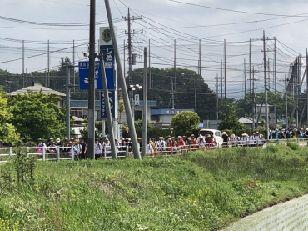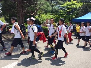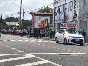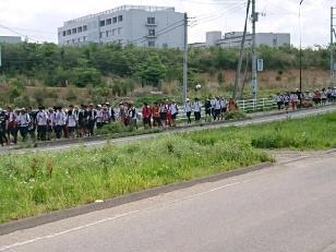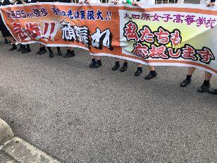 最後の関門を過ぎ、多くの保護者がゴールを待つ大高へ歩みを進めました。その前に、保健センターで態勢を整え、大女高前へと進みました。大女高では、横断幕を掲げ、沿道に多くの生徒が出て声援を送ってくれました。先頭だけではなく、長時間に渡って最後の方の生徒まで応援をしてくれました。大高生はそれに大高ストームで応えました。