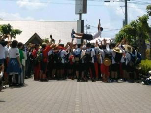 正門にはカメラを持った多数の保護者がゴールの瞬間を待ち構えていました。生徒会長、強歩委員長が感謝の言葉を述べ、胴上げの後大高ストームで歓喜のゴールを迎えました。
