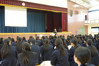 10月22日(水)本校第1体育館において、修学旅行平和学習の一環で事前平和講話を行いました。被爆体験伝承者の東野真理子様をお招きし、東野様のお母様の被爆体験を、克明に詳細にお話しいただきました。生徒の感想は「初めて被爆講話を聞いて、核の恐ろしさや平和の尊さを感じました。二度と戦争が起こってほしくないと思いました。」といった内容が多数ありました。生徒にとって一生に一度になるかもしれない内容の講話であり、貴重な機会になったと思います。
