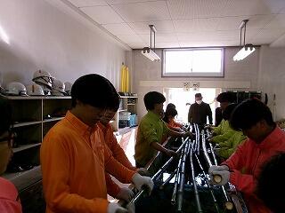 所々についた汚れを全員で協力して落とします。もみ殻を使って磨きました。