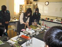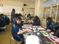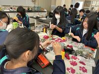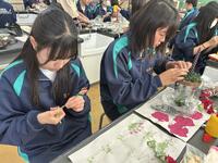 生徒たちには赤が人気のようでした。花びら、がく、アイビーの葉などを先生の指導のもと染色し、こてをあてて花びらや葉を作りワイヤーや薄絹テープを使って組み立てました。