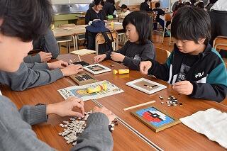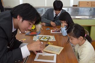 児童たちは、色とりどりの1cm角のタイルを使って思い思いのデザインを表現し、世界に一つだけの作品を完成させました。 生徒たちは、小学生に分かりやすく教える工夫をしながら、ものづくりの楽しさや達成感を共有することができました。