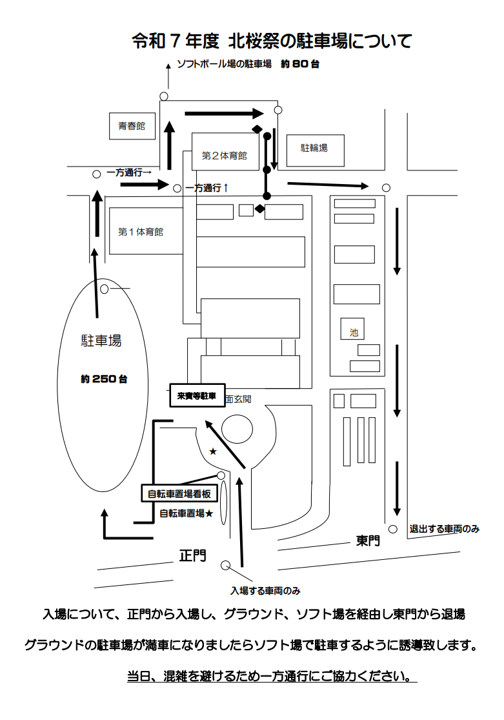 令和7(2025)年度 北桜祭の一般公開は 11月15日(土)に開催します。 ★自家用車でお越しの際は、下図 駐車場案内図をご覧ください。 当日、正門から入場、東門から退場の一方通行となります。 ☆無料シャトルバス(小金井駅⇔北桜高)をご利用ください。