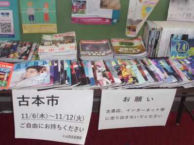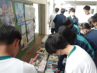 朝の昇降口に、いつもとは少し違う空気が流れていました。図書館より放出された雑誌を並べた「古本市」の案内を掲示したところ、さっそく生徒たちが足を止め、ページをめくり、友と語らいながら選書する姿が見られました。