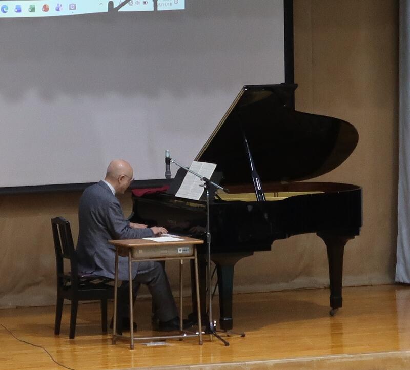 午後1時30分からは、本校の校歌作曲者で作曲家の倉本裕基(北野實)氏をお招きしての記念講演会を実施しました。作曲時の思い出や音楽を通して学んだことなど、ユーモアやピアノの演奏を交えたご講演で、生徒たちは先生の幅広い教養に触れながら、素晴らしい時間を過ごすことができました。
