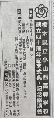 昨日の下野新聞に、本校に関する記事が掲載されました。ご覧いただいた方もいらっしゃるかと存じますが、いよいよ再来週に迫った創立四十周年記念式典に向けて、校内の空気も次第に高まりを見せております。