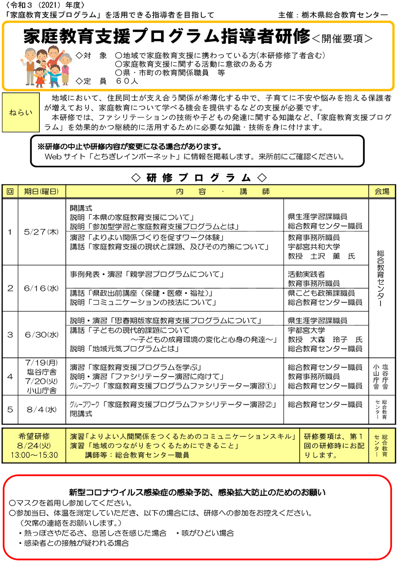 事業のねらい | ファシリテーションの技術や子どもの発達に関する知識など、「家庭教育支援プログラム」を効果的かつ継続的に活用するために必要な知識・技術を身に付ける。 |