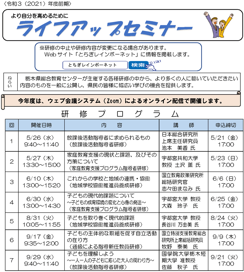 | 事業のねらい | 栃木県総合教育センターが主催する各種研修の中から、より多くの人に聴いていただきたい内容のものを一般に公開し、県民の皆様に幅広い学びの機会を提供します。 |