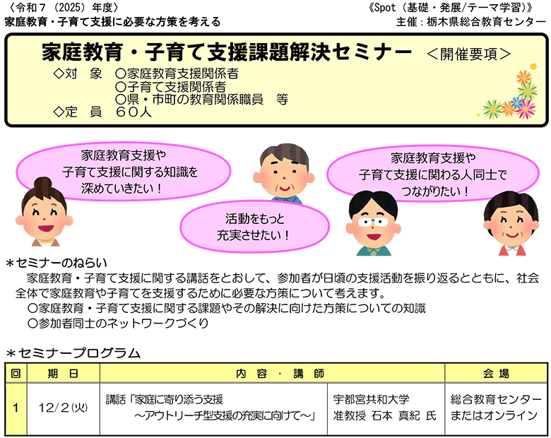 | 研修名 | 家庭教育・子育て支援課題解決セミナー |