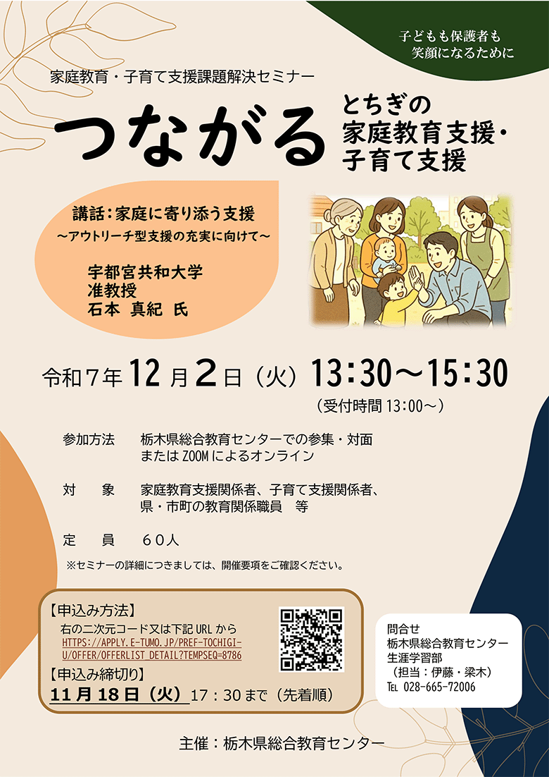 申込方法 下記URLから、栃木県電子申請システムにアクセスしてお申し込みください。 【URL】https://apply.e-tumo.jp/pref-tochigi-u/offer/offerList_detail?tempSeq=8786 申込期間 令和7年10月10日(金)16:00 ~ 11月18日(火)17:30(先着順) その他 ・研修時間は、13:30~15:30です。(13:00から受付) セミナー会場・問合せ先 栃木県総合教育センター生涯学習部 担当:伊藤・梁木 |