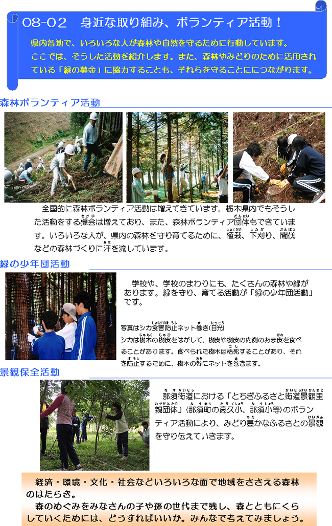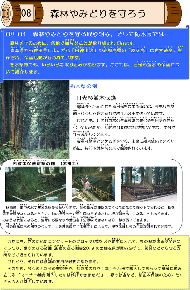 01 栃木県の森林 02 代表的な樹木 03 「林業」ってなあに? 04 栃木県の林業 05 森林のはたらきと保安林 06 「木」ってなんだろう? 07 森林はなぜたいせつなの? 08 森林やみどりを守ろう 08-01 森林やみどりを守る取り組み。 そして栃木県では…