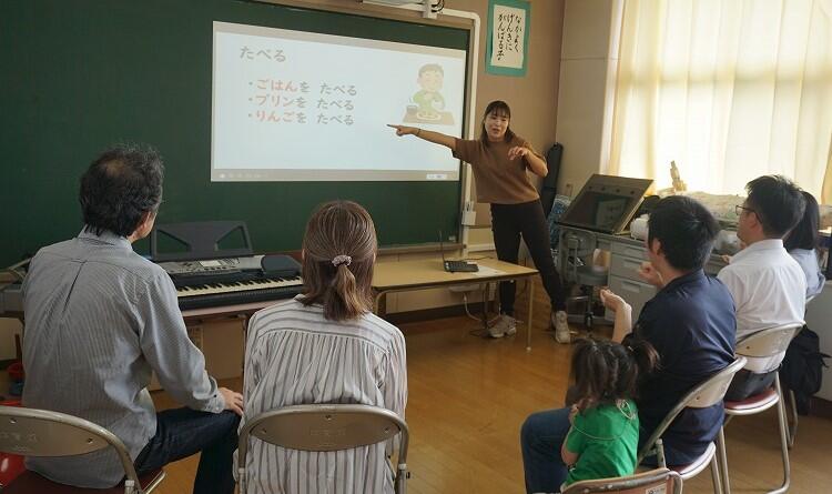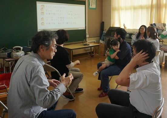 2回目の手話勉強会では、動きの言葉(動詞)について学びました。「たべる、のむ、あそぶ」等、日常の生活の中でよく使う言葉や、同じ言葉でも意味(何を表しているか)によって、手話表現が変わる事などについて学習しました。例えば「袋をあける」「ドアをあける」「ふたをあける」など同じ「あける」でも、その状況に合う手話を使うことを確認しました。手話表現の確認の後は、ペアになって会話の実践を行いました。緊張しながらも、ペアになった人と助け合いながら頑張る様子が見られました。最後に担当者から「動きの言葉の手話を覚えると、二・三語文でのやりとりもスムーズになると思う。今日覚えた手話は、今夜から早速使っていきましょう」と話がありました。