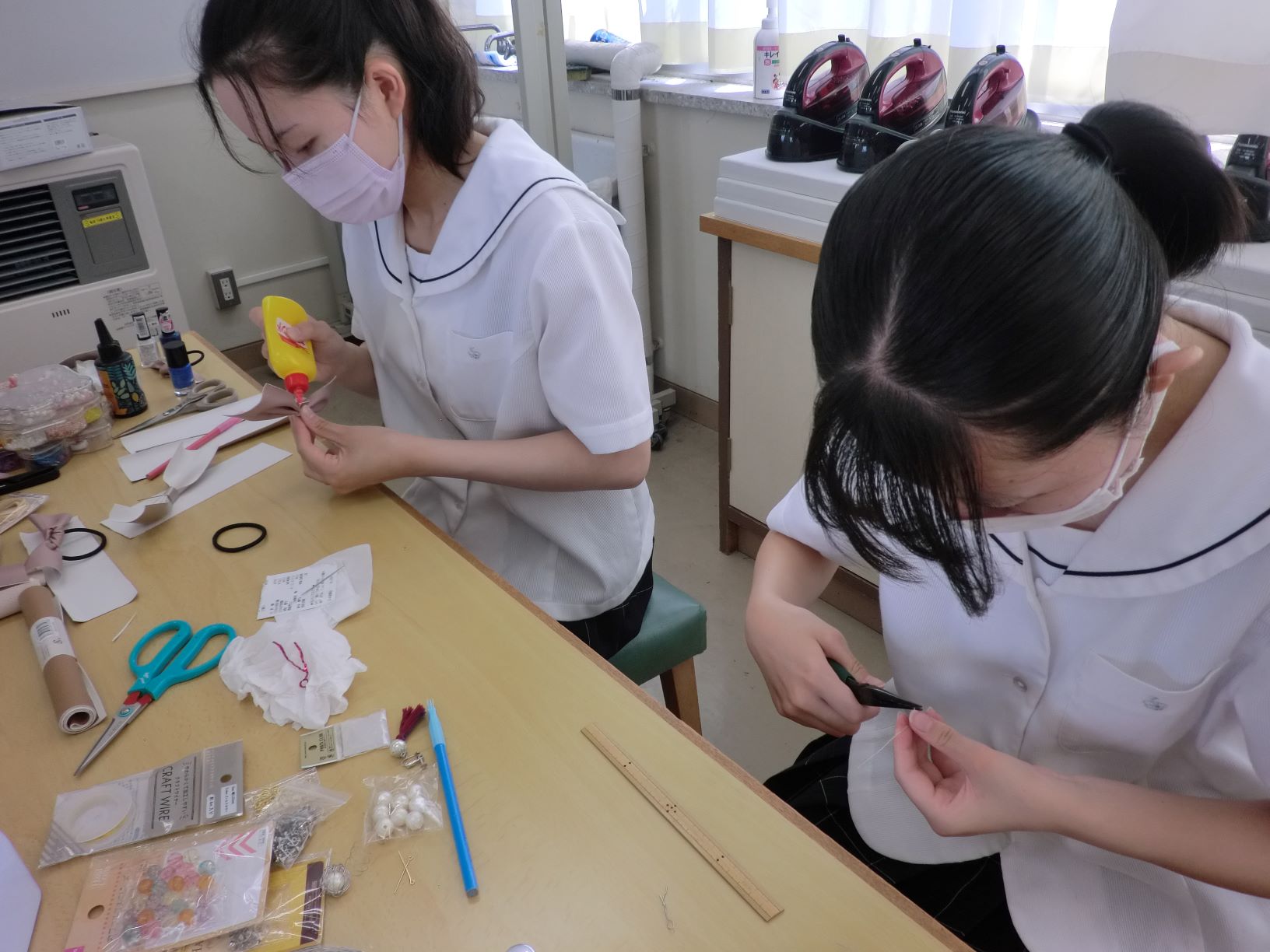 今年はコロナ渦により桜花祭が校内発表のため、校内販売用のアクセサリーやバックの製作をしています。また、アクセサリーを作ってみたい人のために体験コーナーも設ける予定です。