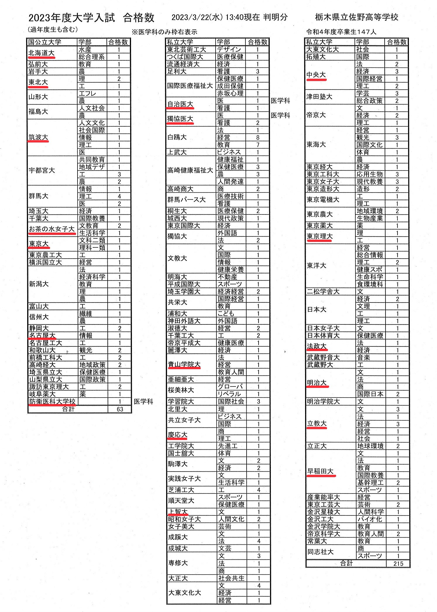 【高3】2023年度「大学合格者数」発表! 投稿日時 : 2023/03/25 校長 3月24日(金)2023年度の「大学合格者数」がほぼ出そろいました。国公立大学63名、私立大学215名と、素晴らしい結果となりました。中でも、初の「東京大学」2名合格や「お茶の水女子大」3名合格など、国公立大学は4学級規模で初の60の大台に乗りました。私立大学も非常に好調でした。本校始まって以来の大躍進を遂げました。よく頑張りました。 R5合格者数.jpg