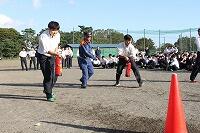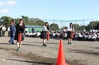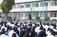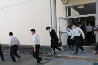 地震発生とそれらによる火災を想定した避難訓練が、10月17日第6時限目に本校で行われました。 訓練は地震発生によって火災が発生、グランドへ避難という想定で、佐野市西消防署3名が見守る中、全校生及び職員が参加しました。避難は迅速に行われ、約5分で避難が完了しました。校長、佐野市西消防署の講評の後、消火器による消火訓練が3年生代表によって行われました。まずは、「火事だ!」と大声で周りの人に伝えることが1番であり、逃げ道の確保も大切であると教わりました。消火器での火の消し方など、いざというときに生かせるようにしたいと思います。