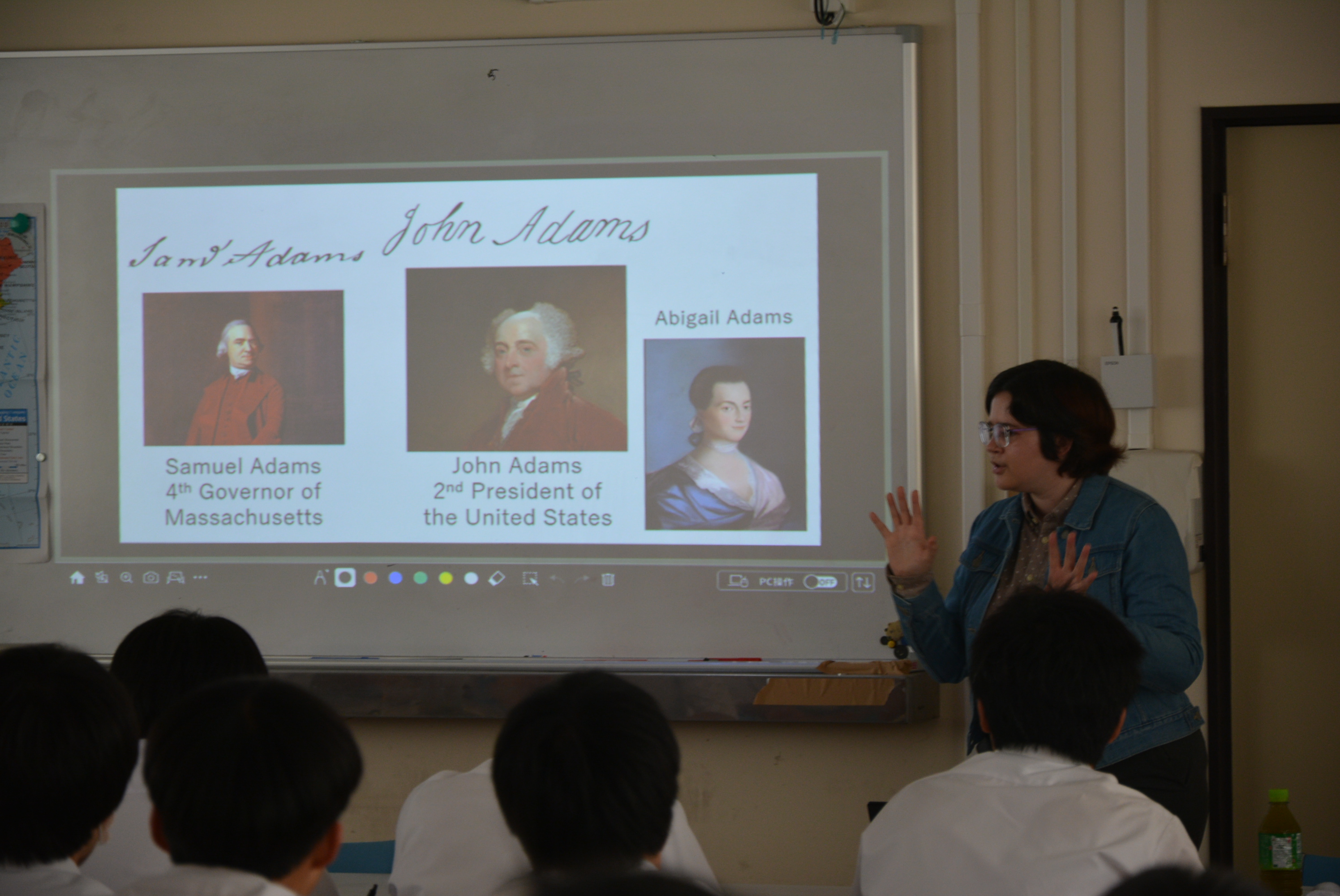 今回は、母国アメリカの歴史や政治制度について英語でお話いただきながら、本校生と交流していただきました。政治への関心度が日米の高校生でどのように違うかといった話題に、多くの生徒が特に興味を寄せていました。