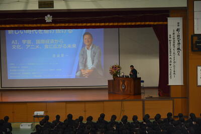 ご講演『新しい時代を駆け抜ける ― AI・宇宙・国際経済から文化・アニメ・食に広がる未来 ―』では、ご自身が手がけられたブランディングの事例を交えながら、「世界平和サミット」「日本的霊性」「ナラティビズム(文脈主義)」など、実に多岐にわたるお話をしていただきました。講演後にもお時間を割いてくださり、生徒からの質問一つひとつに丁寧にお答えいただきました。