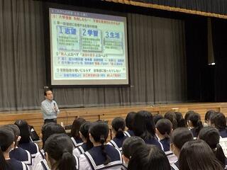 入試全般や推薦入試の話に続き、一般入試に向けた今後の学習・生活・心構えについて力強く内容の濃い助言をいただきました。不安を吹き飛ばす勢いの講話に、最後まで諦めず頑張る決意が固まりました。