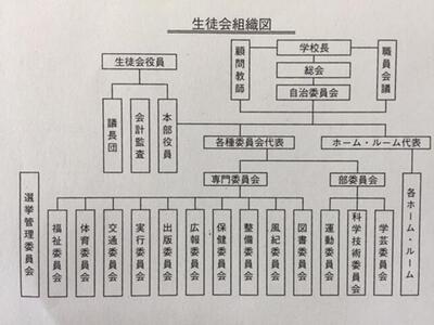 生徒会役員は、会長1名、副会長2名、会計監査3名、書記長1名、書記2名、会計3名、庶務2名、