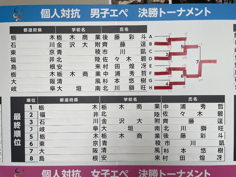 中浦は、トーナメント1回戦、吉森蓮選手(和歌山北高校)に15ー7で勝利しました。トーナメント2回戦は、山本風惺選手(東海大翔洋・静岡県)に15ー5と勝利しました。続くトーナメント3回戦、ベスト8をかけた戦いになります。相手は、公式戦で一度も勝った事がない埋橋匠選手(星槎国際川口・埼玉県)との試合となりました。やりづらさもあったのか、序盤・中盤とリードを許す展開となり、非常に苦しい戦いとなりました。終盤で何とか追いつき、逆転し、そのままリードを守り15ー13で勝利を収めることができました。本人は、雄たけびと共に安堵の表情を浮かべていました。続く準々決勝が始まる前に、足を痙攣するというアクシデントに見舞われました。ドクターや看護師さんが緊急で足のケアをしてくださったのですが、足の痙攣は収まらず、そのまま試合開始という事になりました。動かない足を引きずりながらも何とか点数を重ね、15ー9で村田煌冴選手(安来・島根県)に勝利しました。続く準決勝も、足の痙攣が収まらず、さらに痙攣がひどくなり、試合途中5分間取ることができるインジャリータイムを取り、休息をしました。5分後少しは良くなったものの、状況はあまり変わらず、痙攣した状態で足を引きずりながらの試合となりました。何とか15ー14で北川獅旺選手に(大垣南・岐阜県)勝利し、決勝進出を決めました。決勝戦、相手は、佐々木碧選手(北陸・福井県)との対戦でした。足は変わらず動かず、リードを許す苦しい展開となりました。終盤に何とか同点に追い付き、延長戦(1点取った方が勝利)となりました。最後は、気迫で相手の懐に飛び込み、中浦のランプのみが光り、14-13で勝利が確定しました。本人は満身創痍のなか、よく頑張ったと思います。本人は、涙を流しながら優勝の喜びを嚙み締めていました。応援にきていた家族や部員をはじめ、インハイTVのライブ中継で応援してくださった先生方も涙を流しながら応援してくださっていたと後から聞き、本当に優勝して良かったなと心から思いました。応援ありがとうございました。試合終了後、すぐ表彰式が行われました。試合会場全体に男子エペ個人対抗優勝栃木商業高校中浦秀哲の名前がアナウンスされ、感慨深かったです。試合会場では、多くの人から「おめでとうございます」「感動しました」との言葉を頂き、今までやってきた事は間違えではなかったのだと、全国の大舞台で証明できた気がしました。エペ種目としては県勢としても初優勝という事で、頑張ってきて本当に良かったと思える瞬間でした。