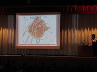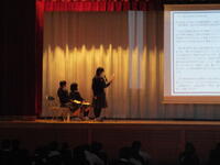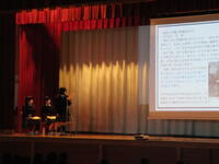 ご講話では、北村様の祖母の日記を読み進めながら当時の人々の様子や被爆の実態を詳しく知ることができました。原爆が投下された1945年8月6日で今までの日常が一変し、日記からは被爆者の救護に奔走しつつ不安な気持ちを募らせる祖母の心情が身に染みて伝わってきました。また日記の一部を本校の放送部員が朗読することで、生徒たちの心にも大きく響いていました。