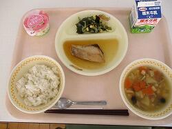 【献立】麦ご飯 いものこ汁 ぶりの照り焼き 海藻サラダ ももゼリー 牛乳